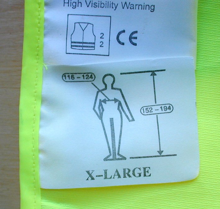 During the last few days there have been various newspaper articles describing proposed new labelling for clothing. This labelling is in fact the EN 13402 European standard for labelling clothing sizes and is expected to come into widespread use by the end of 2007. The work was sponsored by CEN (European Standards Organisation – an organisation that draws its membership from various European bodies), while much of the fieldwork was done by the BSI (British Standards Institute). The photograph below (by Markus Kuhn and downloaded from the Wikipedia site) shows an actual label used for a high-visibility jacket.