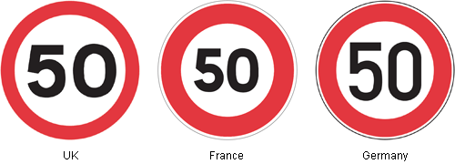 However, more obvious and serious differences between UK signs and those of all other European countries have been ignored. The signs below show speed limits as seen in the UK, France and Germany.