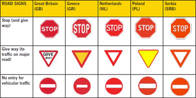 As examples of how signs vary, the report shows 3 key signs as implemented in 5 different countries.