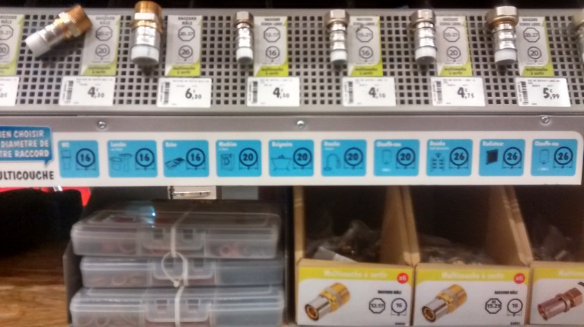 And so on. It took us a while to get used to each other’s thinking, and we wondered how the French managed. The local DIY store provided some clues (and a breathtaking view from its car park – British DIY enthusiasts are allowed to be envious).    Here are some shelf labels in the store:This shows recommended supply pipe sizes for various appliances: bath, basin, wc, etc.So it seems the French go in for “metric sense” too. Which reminds me of an incident early in the 1970s. I was then working in the London office of Arups on the design of Centre Beaubourg, later renamed Centre Pompidou, in Paris. The UK had been one of the first countries in the world to adopt SI. French engineers visiting the London offices said they had no difficulty with our use of millimetres, but they were really struggling with kN for force and N/sq mm for stress. But that is another story.