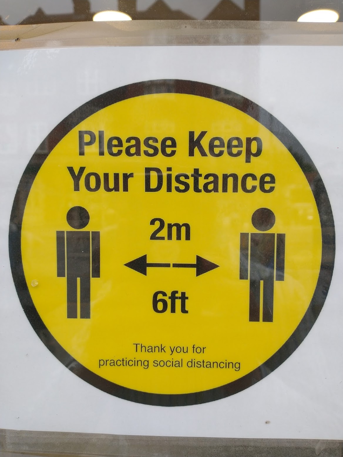 7. Actually, 2 m is closer to 6 ft 7 in, but the conversion 6 ft 6 in is more than accurate enough. What I find reassuring is that the metric distancing is correct in almost all cases. I suspect that the one in the shoe shop showing the distancing as 1·5 m is of American origin, where the official distancing is 6 ft.