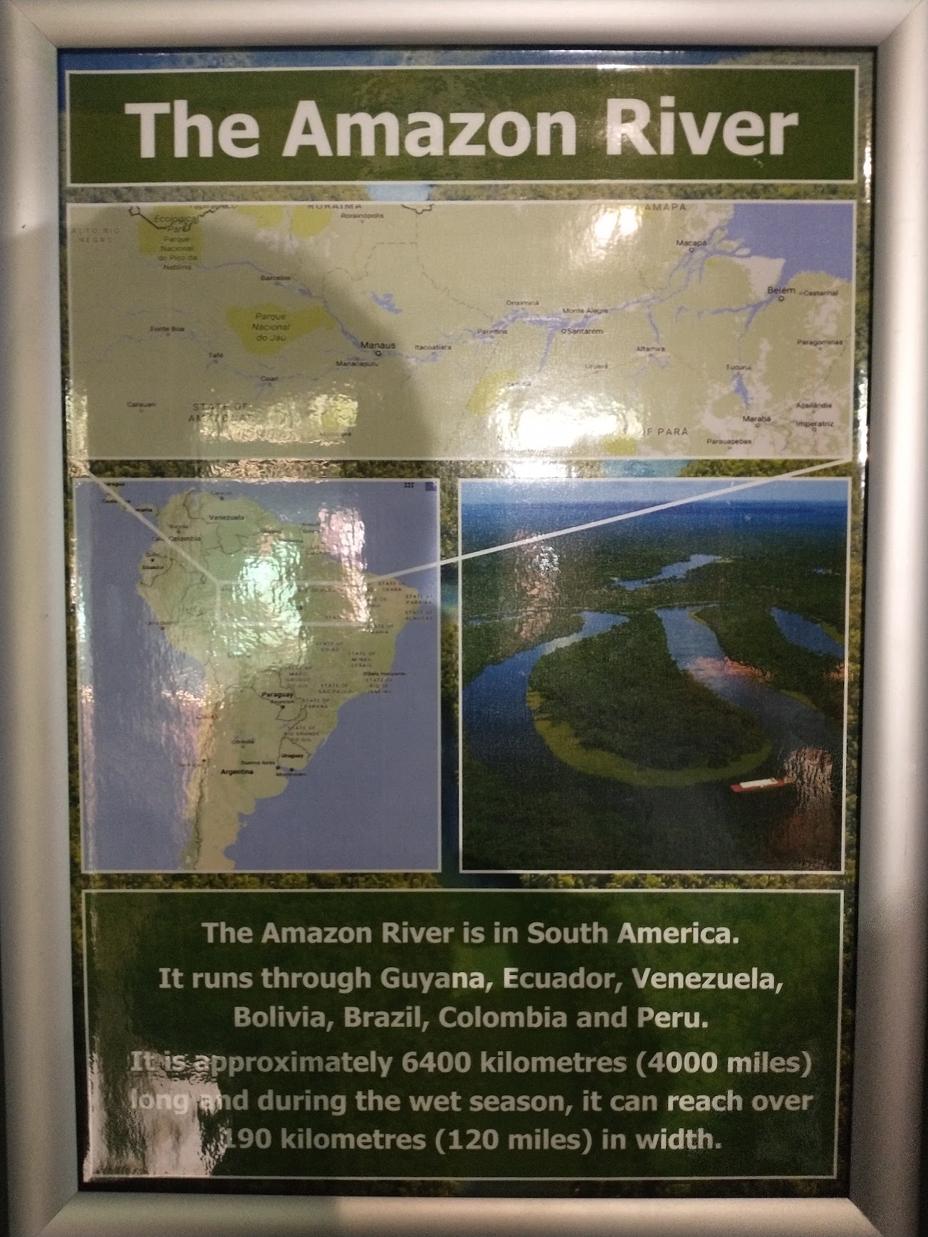The Amazon River poster shows kilometres followed conversion to miles in brackets. In other parts of the venue, miles and kilometres are used without any conversions, even when describing the same topic. For example, here is a description of the Amazon on another poster: