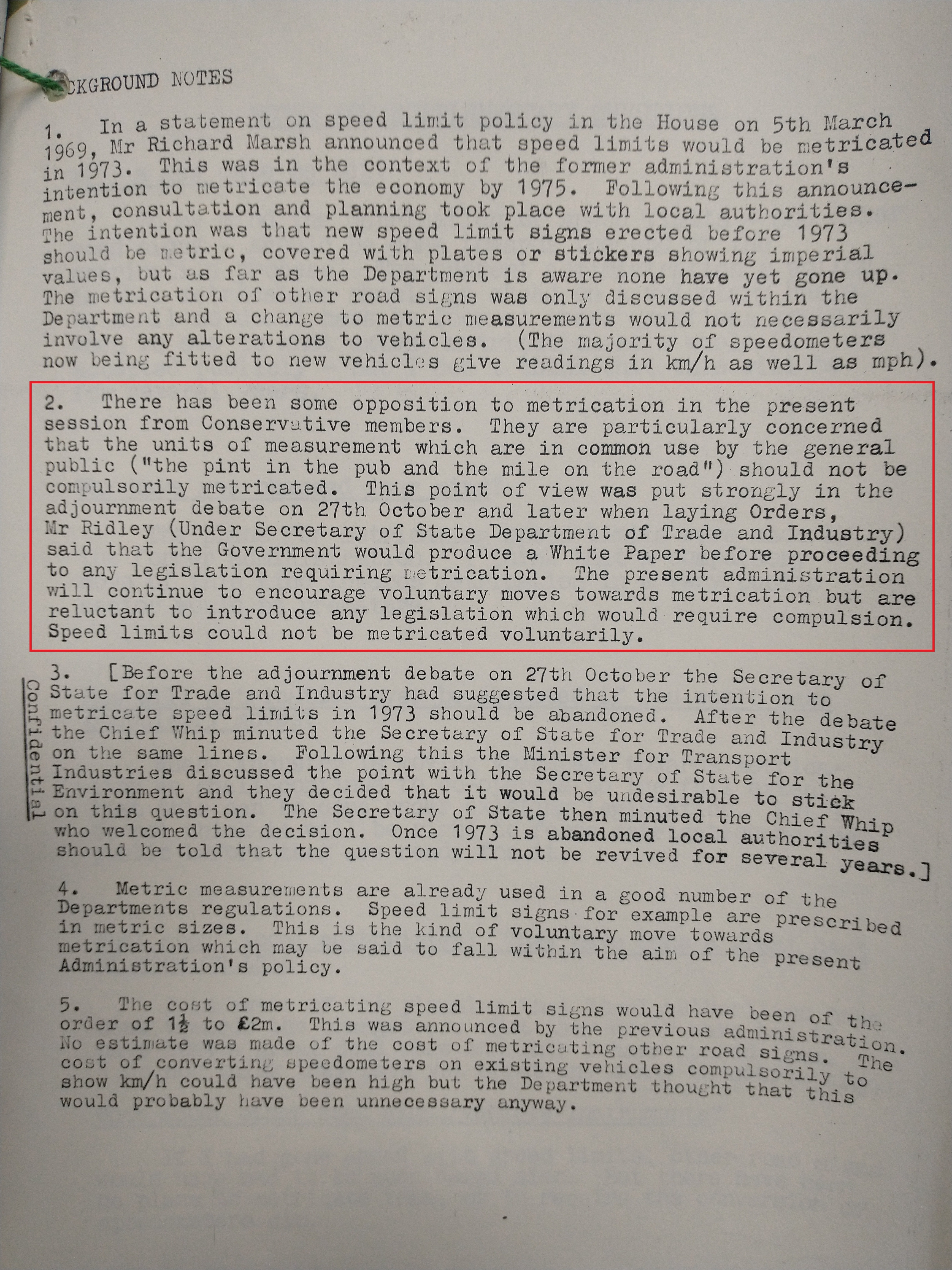 Point number 2 in the Background Notes papers reveal opposition from Conservative MPs and that it was official government policy that metrication should be voluntary.