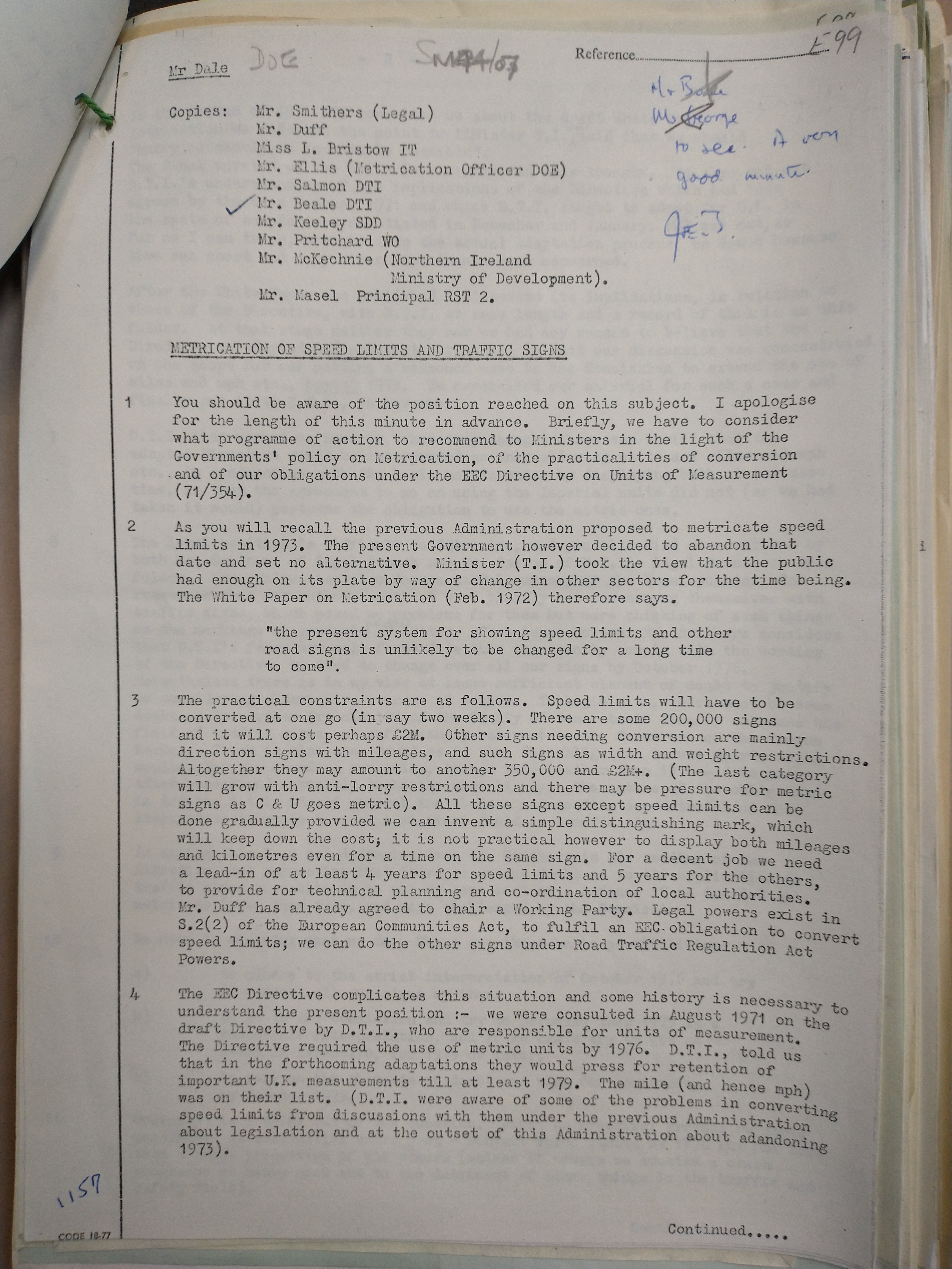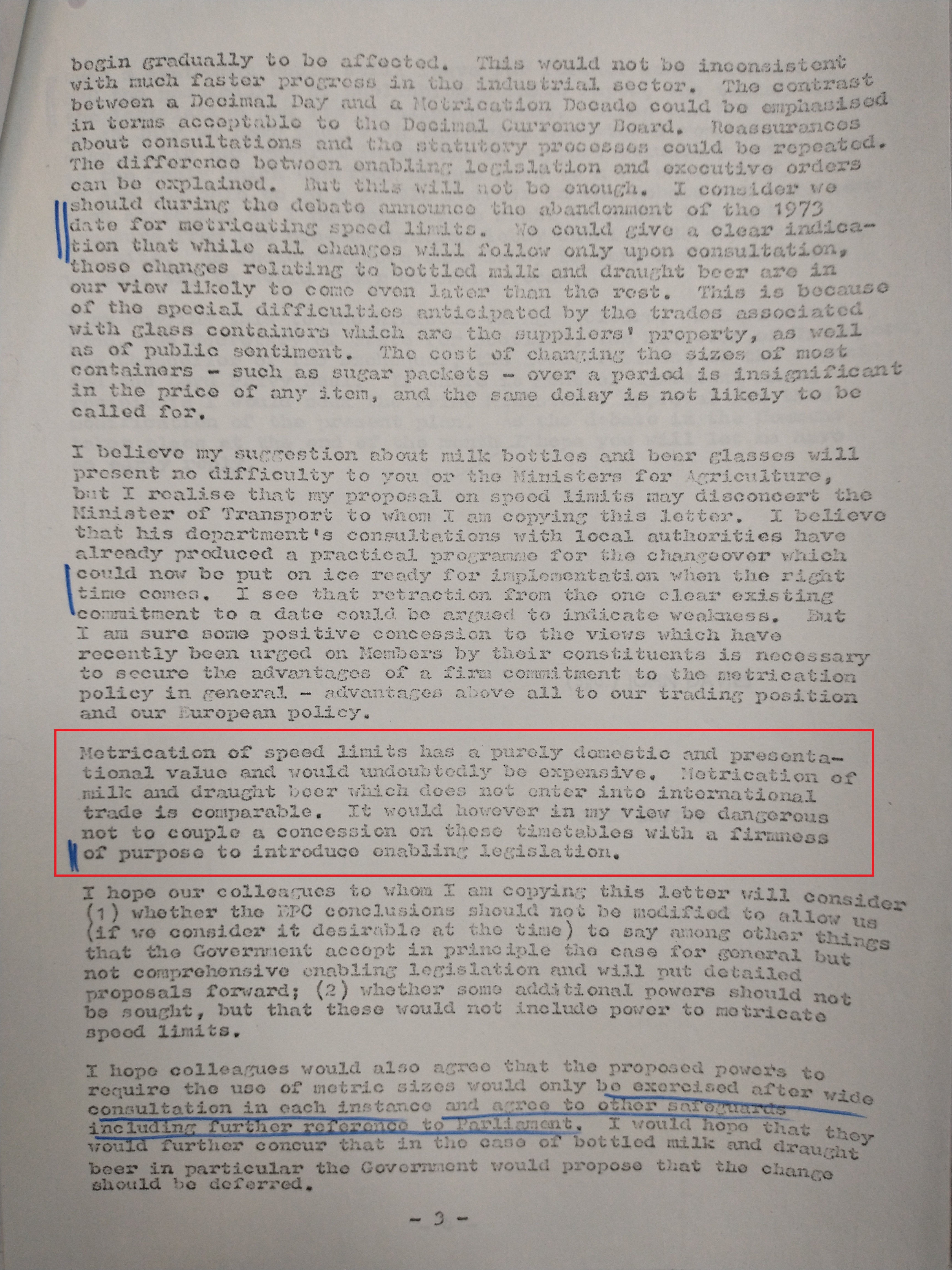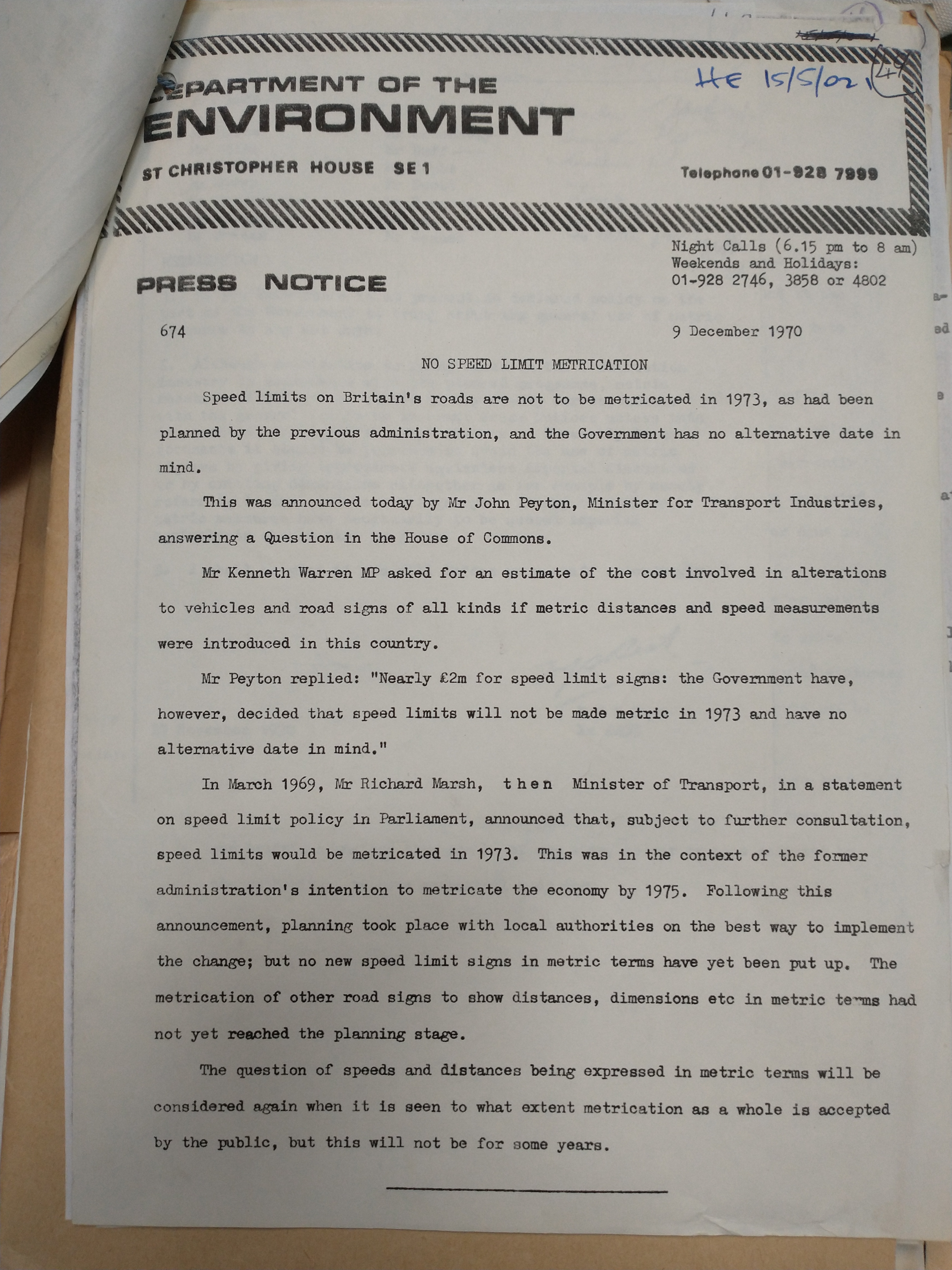 On 9 December 1970, the Minister for Transport Industries John Peyton announced that the Government have decided that speed limits will not be made metric in 1973 and have no alternative date in mind. Why did the Government scrap the metrication of speed limits? Historical government documents give various reasons for scrapping the planned conversion. This article will show some of these documents, which reveal the reasons the Government gave for its decision.
