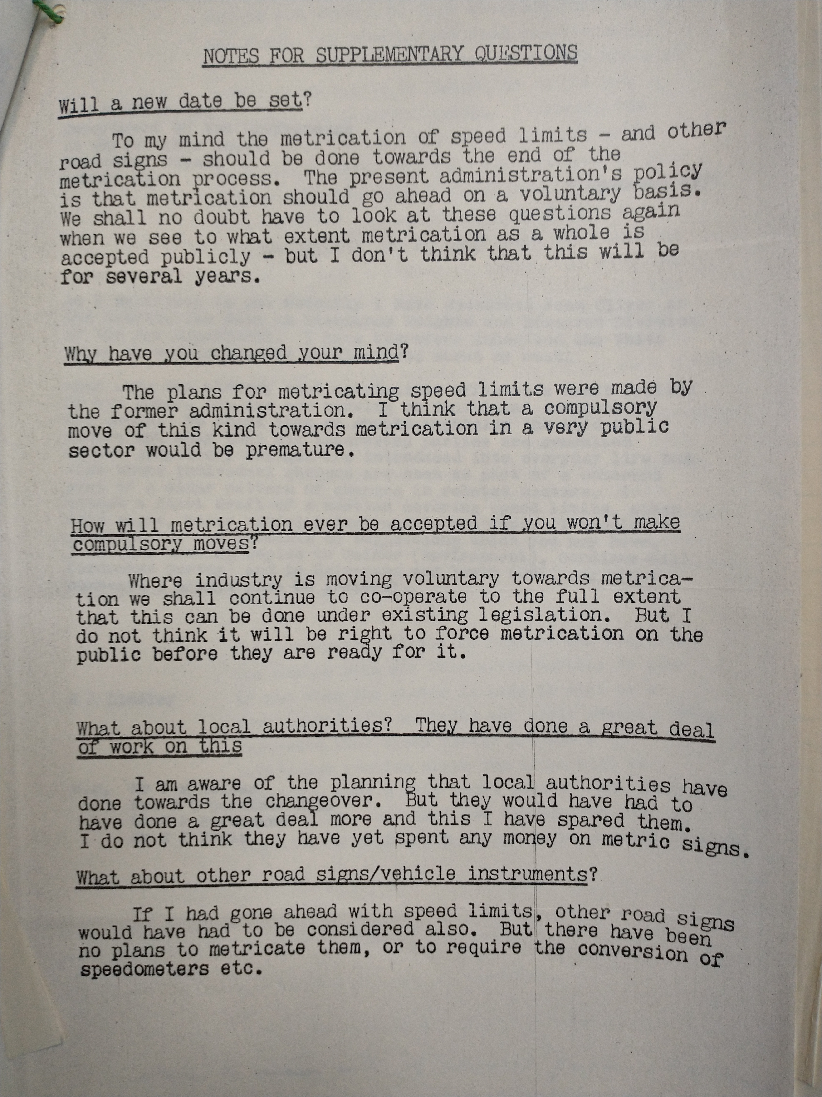 The Notes to Supplementary Questions paper gives us valuable insights into government thinking when the proposed metrication of speed limits was scrapped.