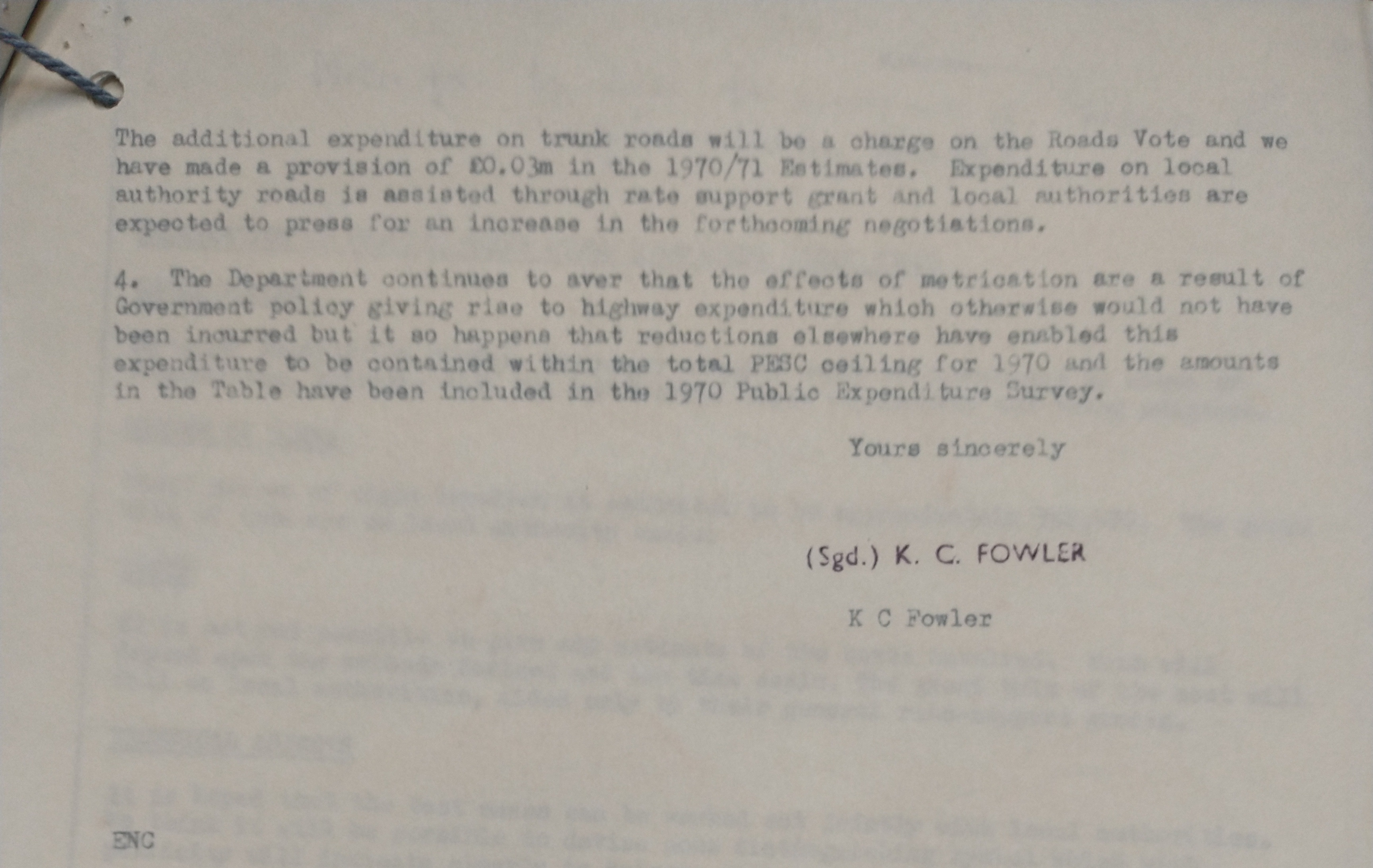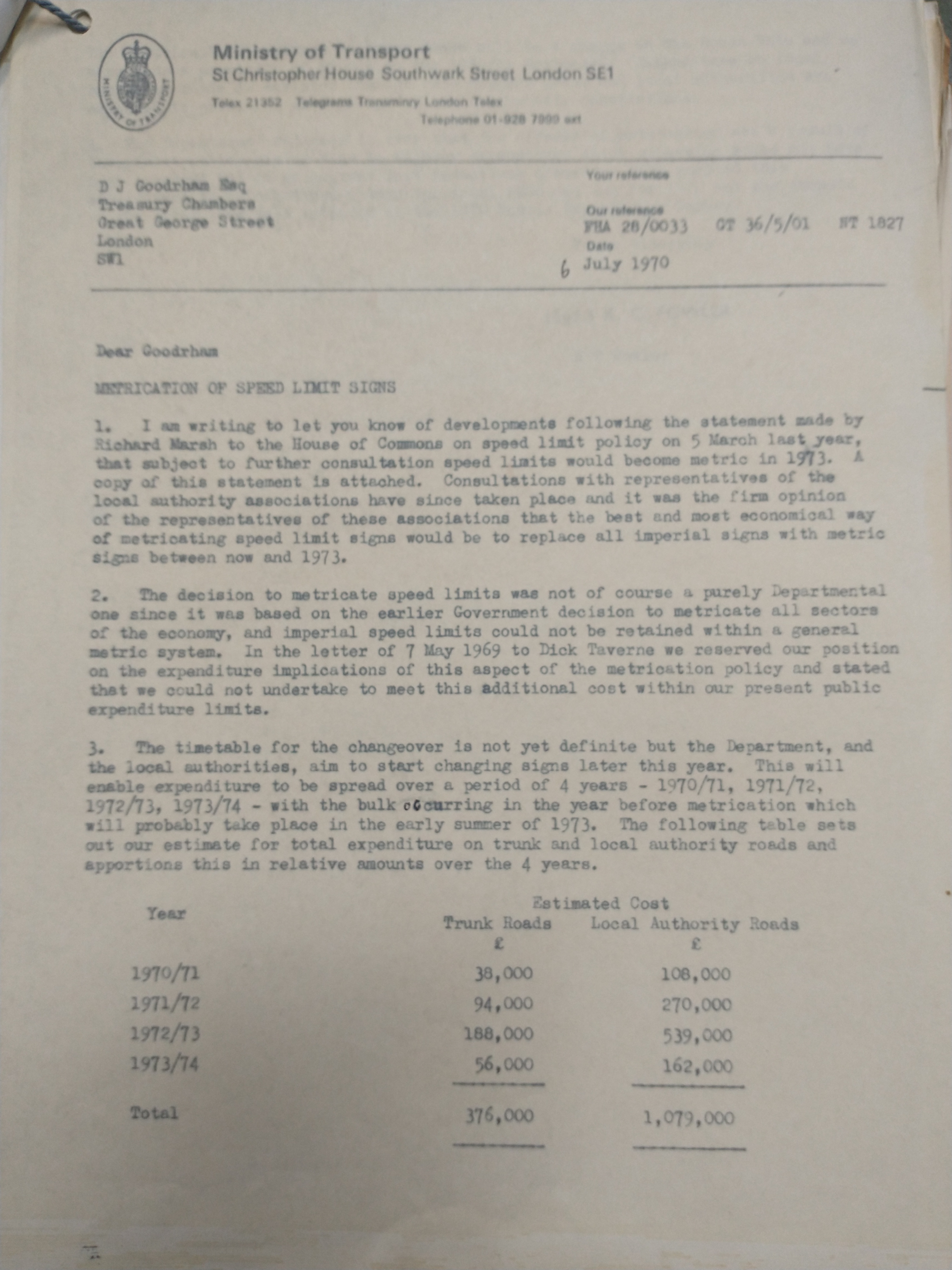 A letter from KC Fowler at the MOT to DJ Goodrham Esq at Treasury Chambers on 6 July 1970 explained the breakdown of estimated costs for trunk roads and local authority roads over four financial years in the early 1970’s. It also included some other relevant information about the planned conversion of speed limits to km/h.
