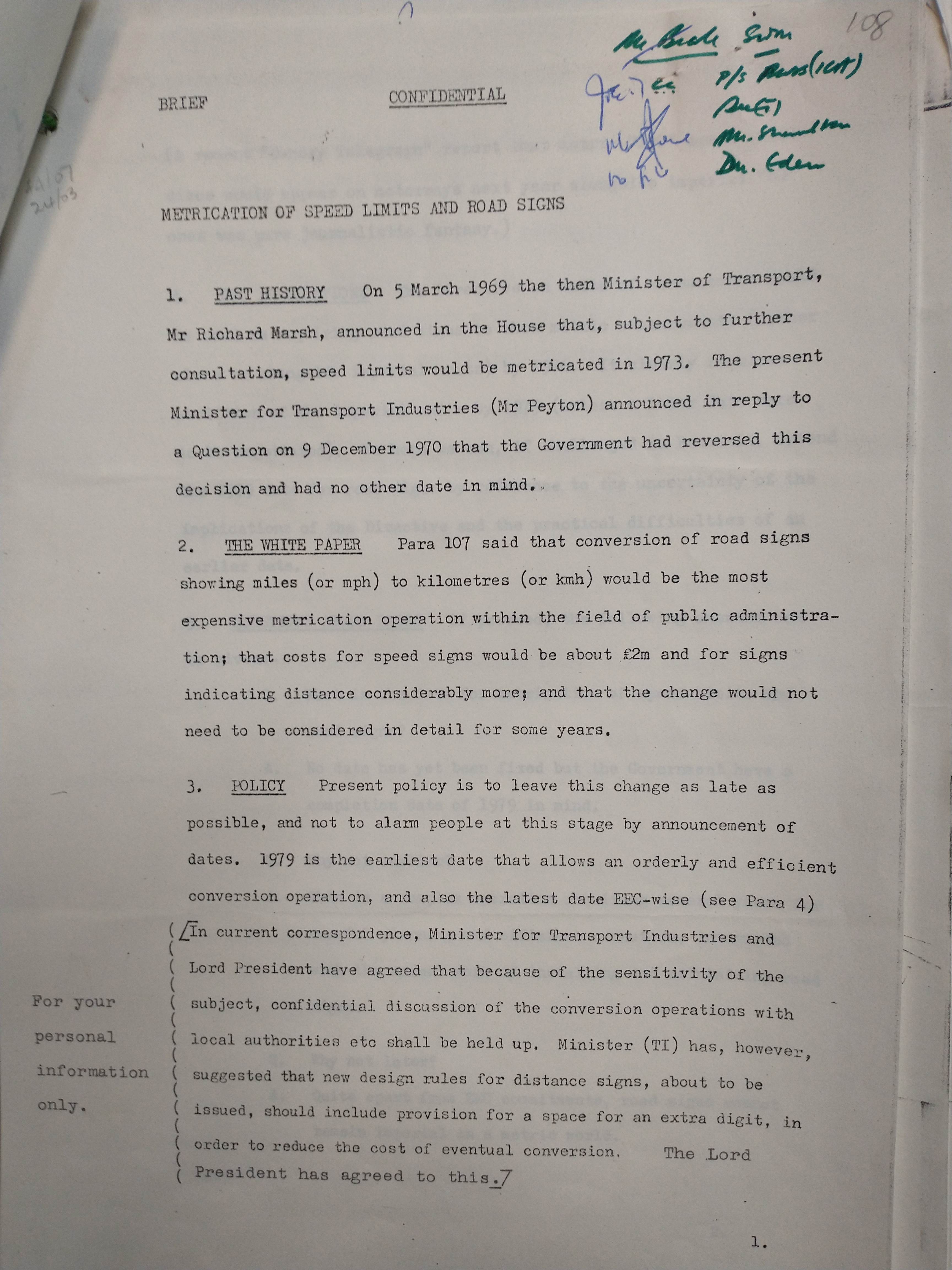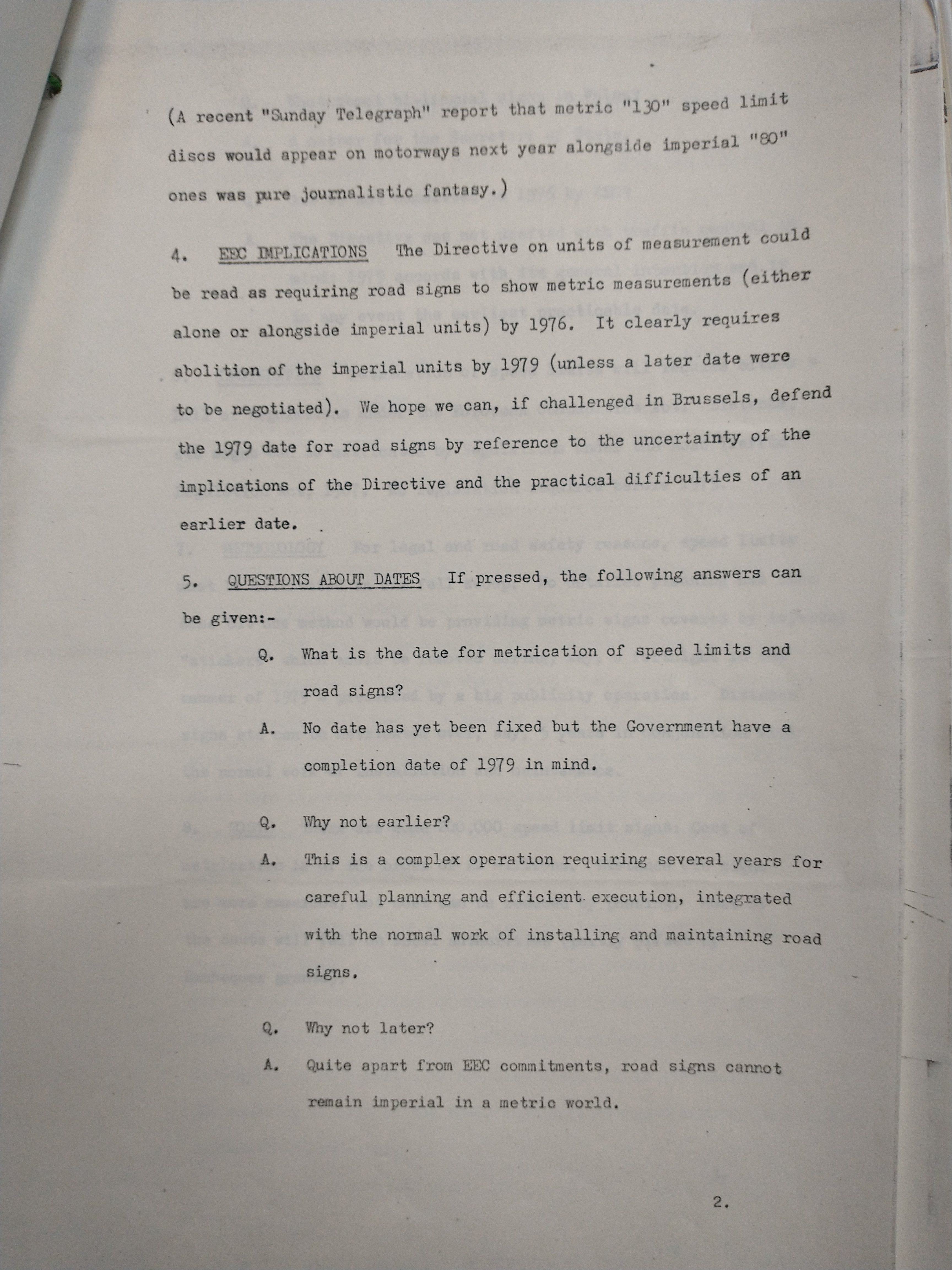 An official briefing paper on the metrication of speed limits and road signs contained a section called QUESTIONS ABOUT DATES. This section contained a list of prepared answers for specific questions. On the question of the date for metrication of speed limits and road signs, the prepared answer was that no date has yet been fixed but the Government have a completion date of 1979 in mind. On the question “Why not earlier?”, the prepared answer was that this is a complex operation that required several years for planning and execution alongside the normal work on road signs. On the question “Why not later?”, the prepared answer was, “Quite apart from EEC commitments, road signs cannot remain imperial in a metric world.” (my emphasis)