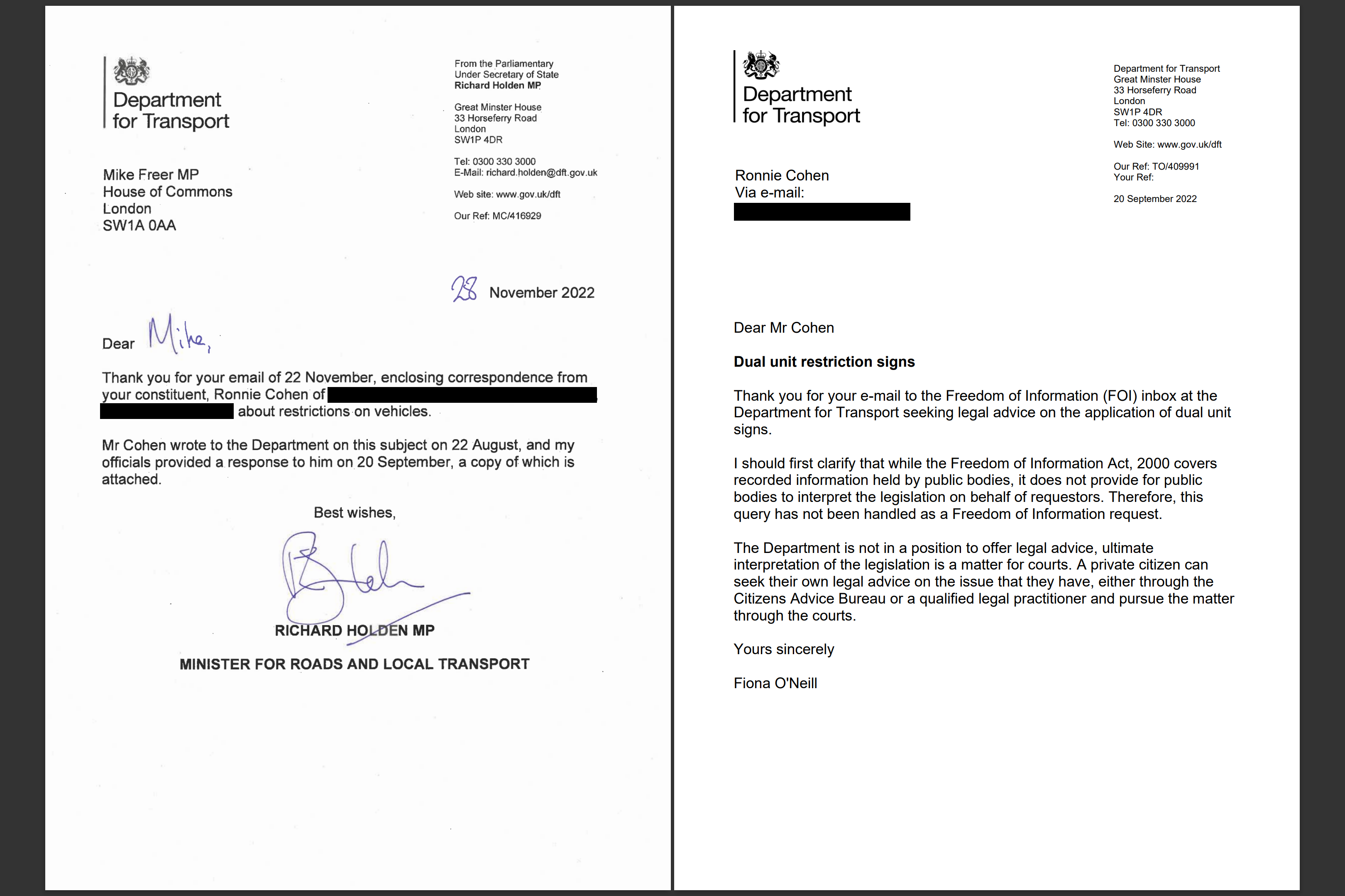 Richard Holden, Minister for Roads and Local Transport, gave me the same answer as the DfT. So, the legal ambiguity remains. It is still unclear whether drivers can drive under a bridge when their vehicle complies with only one value of a dual height sign.