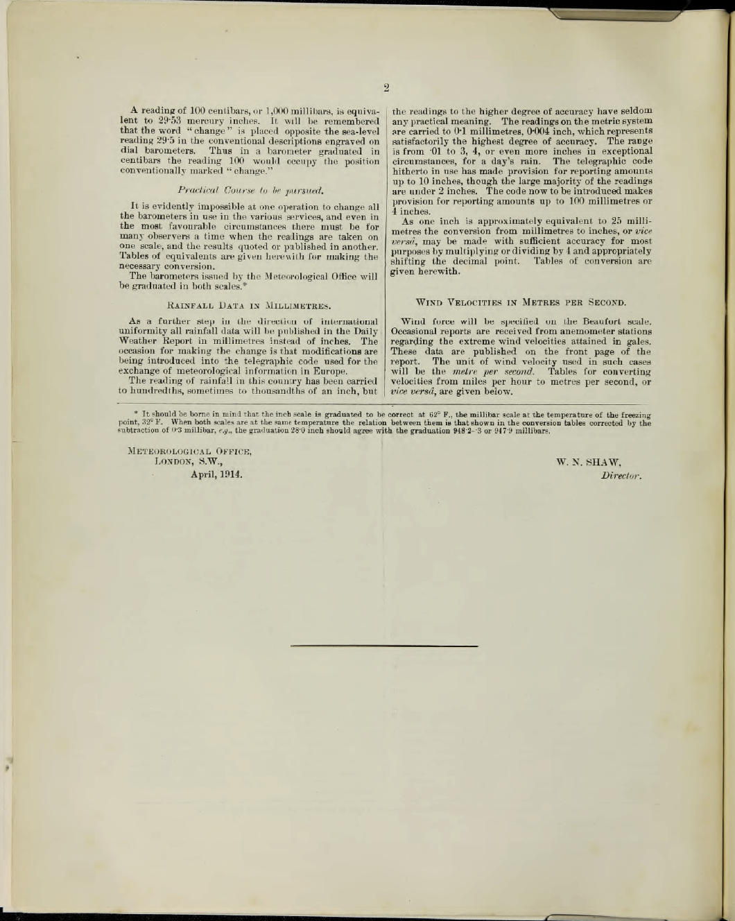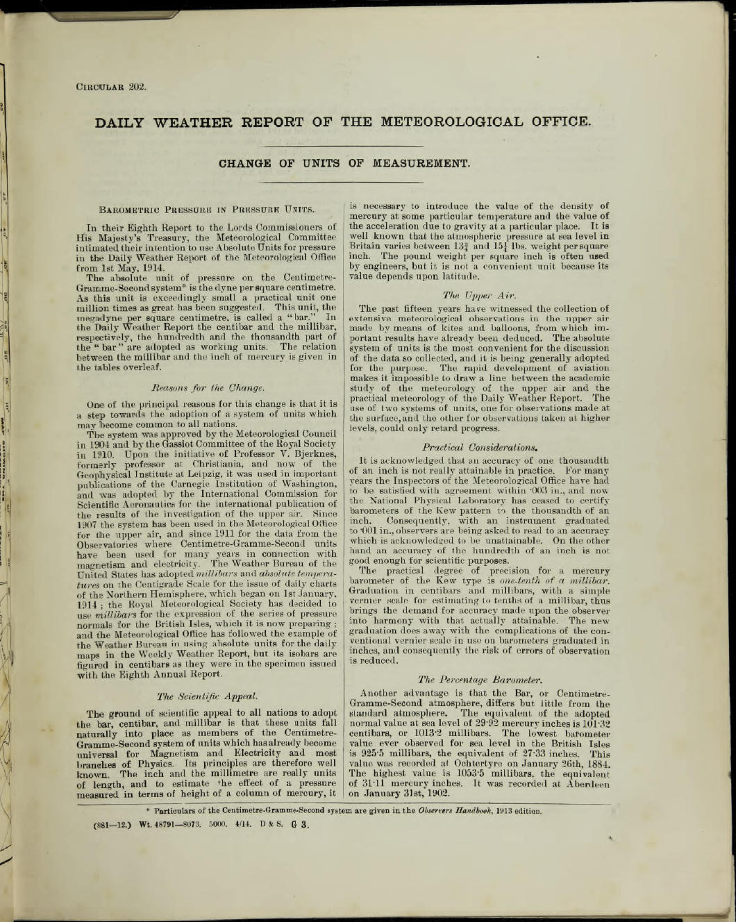 The system was approved by the Meteorological Council in 1904 and by the Gassiot Committee of the Royal Society in 1910. Upon the initiative of Professor V. Bjerknes, formerly professor at Christiana, and now of the Geophysical Institute at Leipzig, it was used in important publications of the Carnegie Institution of Washington, and was adopted by the International Commission for Scientific Aeronautics for the publication of the results of the investigation of the upper air. Since 1907 the system has been used in the Meteorological Office for the upper air, and since 1911 for the data from the Observatories where Centimetre-Gramme-Second units have been used for many years in connection with magnetism and electricity. The Weather Bureau of the United States has adopted millibars and absolute temperatures on the Centigrade Scale for the issue of daily charts of the Northern Hemisphere, which began on 1st January 1914; the Royal Meteorological Society has decided to use millibars for the expression of the series of pressure normals for the British Isles, which it is now preparing; and the Meteorological Office has followed the example of the Weather Bureau in using absolute units for the daily maps in the Weekly Weather Report, but its isobars are figured in centibars as they were in the specimen issued with the Eighth Annual Report.