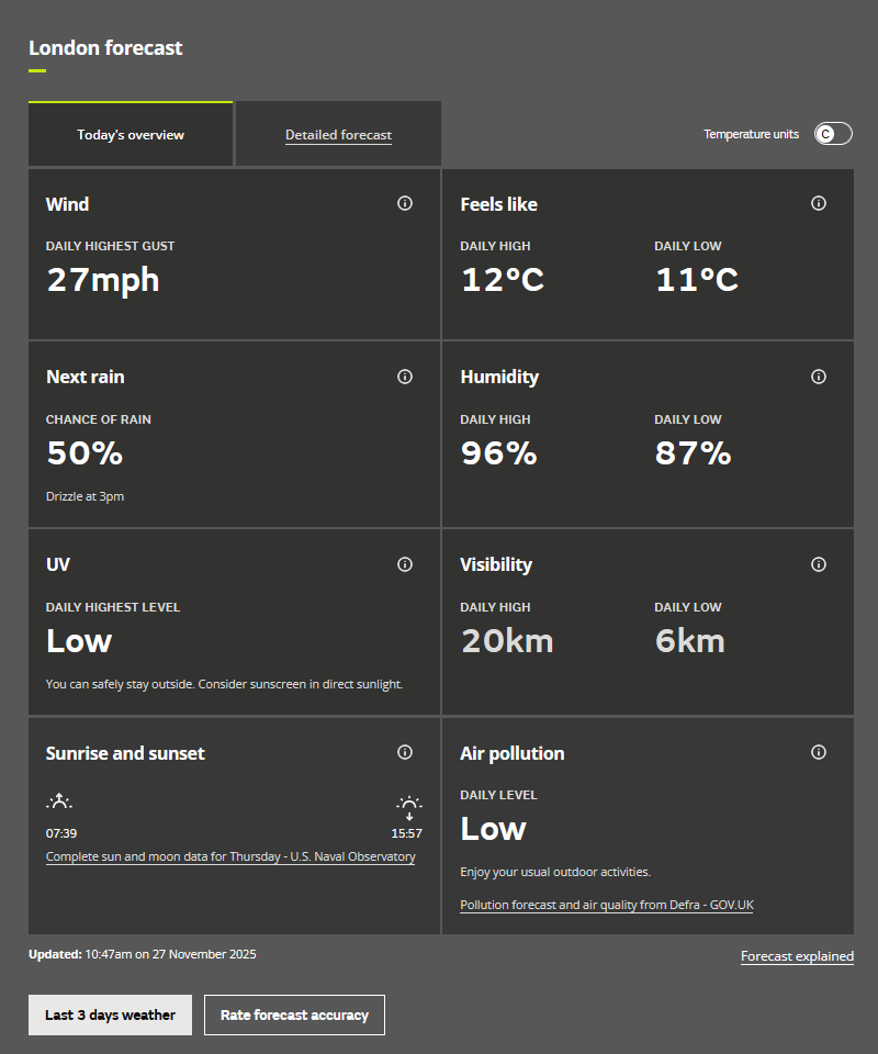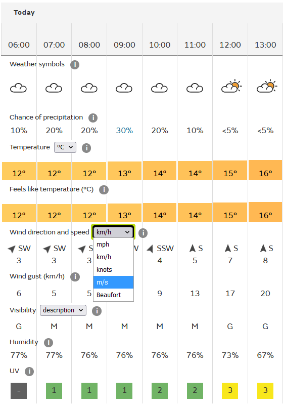 I checked the website a few minutes ago. It appears that the overview forecast does not provide the users with any options regarding choice of units of measure – temperatures are in °C (but are specified only as 11° – no “C” or “F”) and wind speeds in mph. The detailed forecast which is an expanded view for selected weather phenomena (temperature, precipitation, wind, UV and humidity defaults to wind speed in mph, but gives the use the option of using °C or °F. For the record, the expanded wind data gives average wind speed and maximum expected gusts).