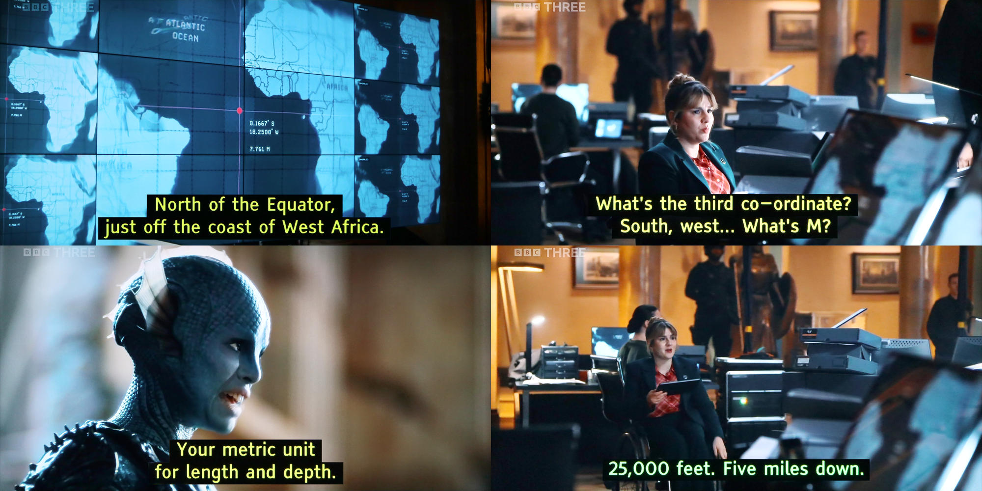 In Episode 2 of The War Between the Land and the Sea, when the Sea Devils (now known as Homo aqua) meet with a United Nations assembly in London, they give the coordinates of their underwater location to the UN representatives. The scientific experts at U.N.I.T. are bewildered by the depth coordinate, which is given to them in metres.