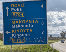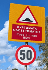 Shorter distances – e.g. to a junction – are also in metres. Speed limits are always in km/h – but with one little quirk. A limit of 65 km/h is very common on some urban or narrower rural roads. Why 65 and not either 60 or 70? Local Cypriots I have asked have no answer, and I can only assume it is a direct conversion from an old 40 mi/h limit. Otherwise limits consist of 20 km/h in some residential areas, 30 over speed bumps, 50 in towns and villages, 80 on two-lane main roads, and 100 km/h on the only motorway, between Paphos and Larnaca.